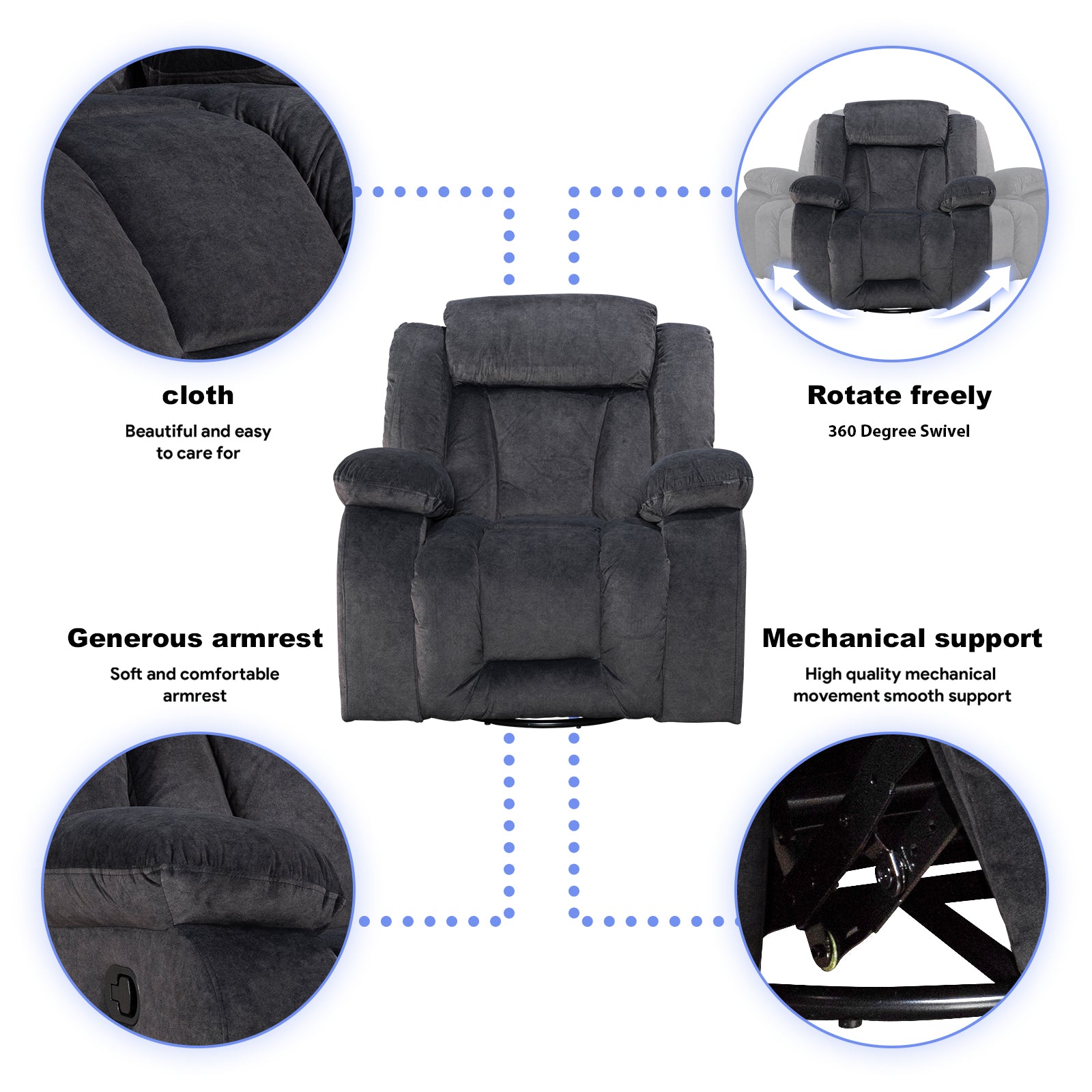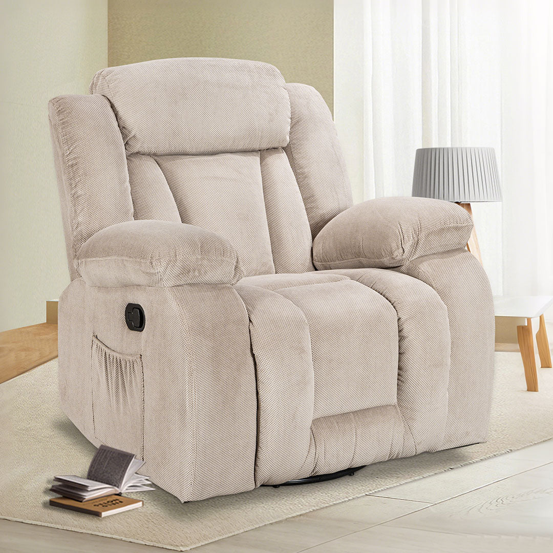 90°-165° wide-range tilt function and manual adjustment of footrest. This cozy recliner is generously crafted with premium fabric. With the simple reclining pull tab, you can lay back into a space of ultimate napping and infinite comfort. There is no doubt that this recliner can bring you the best experience.