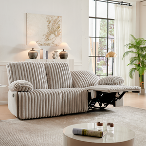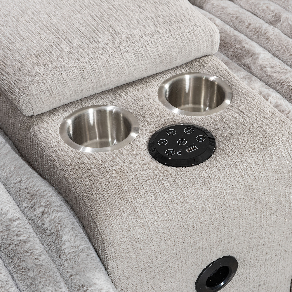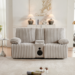 The plush fabric reclining console sofa offers a variety of combination options to enhance your living space. This sofa has a large comfortable seat and a sunken comfort design with pillow armrests for added comfort. This sofa is equipped with Bluetooth speakers for the ultimate relaxation experience.